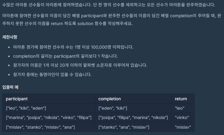 participant와 completion을 정렬하고 다른 데이터 한개만 쏙 빼면 되겠지만 이 문제의 카테고리가 "해시"이기 때문에 해시로 풀어보자.