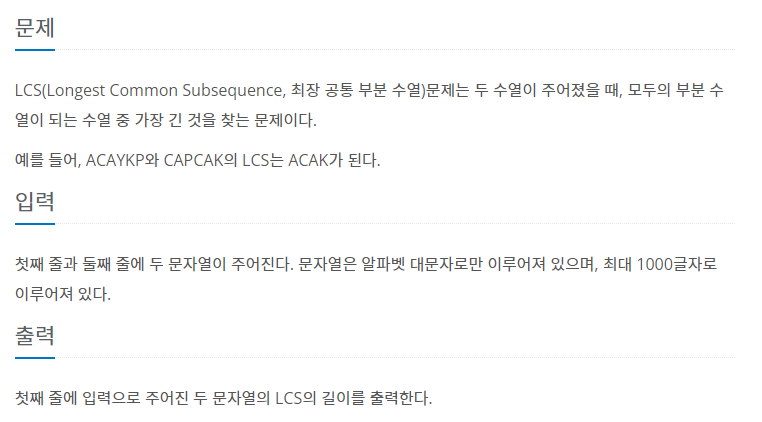 LCS, 즉 각 문자의 수열에서 공통된 부분을 가진 수열의 최대 길이를 구하는 문제다.