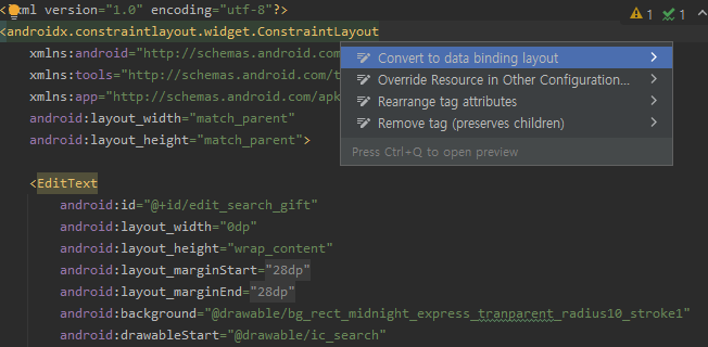 윈도우에서는 Alt + Enter를 누르면 바로 Databinding 셋팅을 해주는 명령어가 나온다.